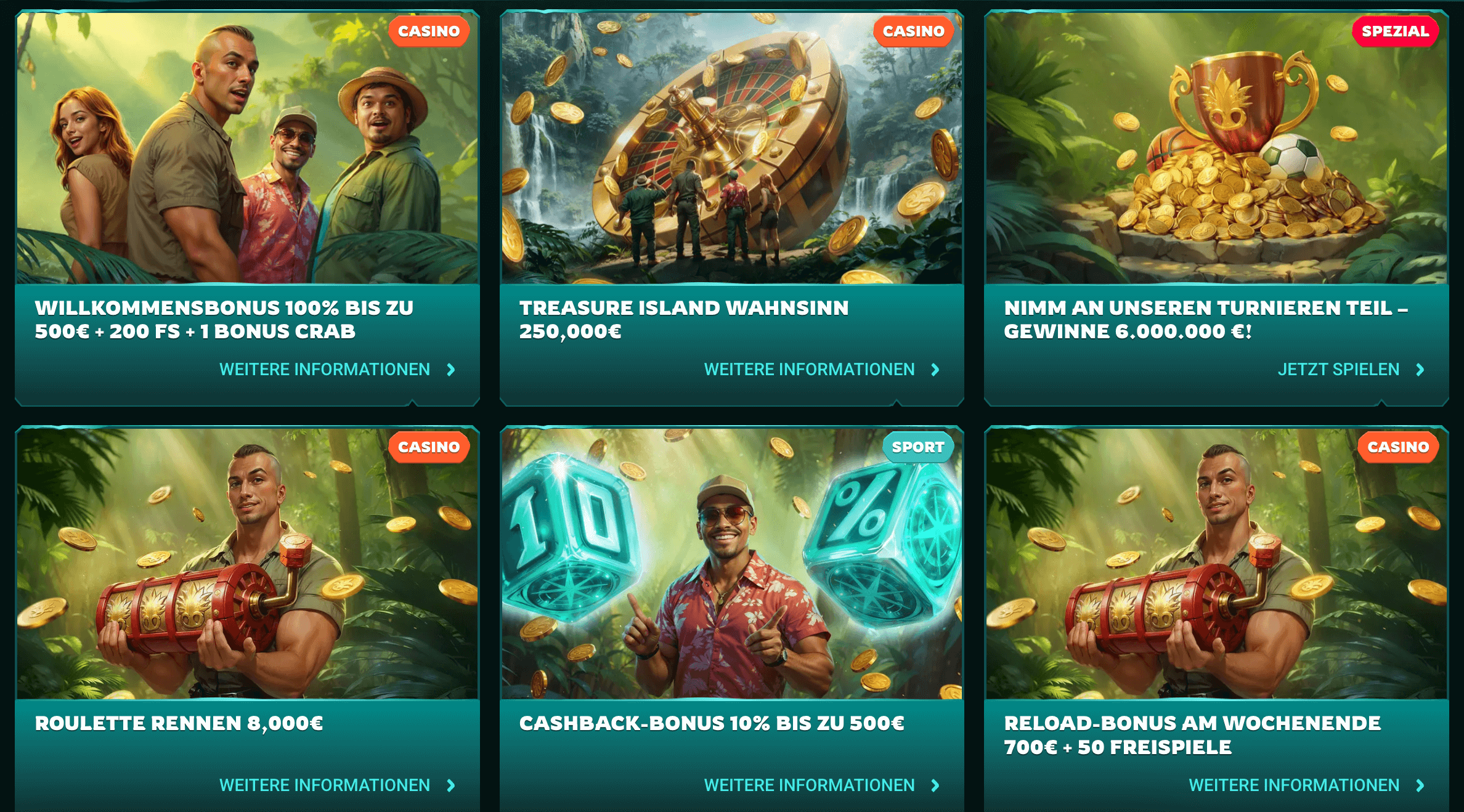 Die Casino-Website bietet mehrere Willkommensboni im Gesamtwert von bis zu 9.500 EUR. Besonders hervorzuheben sind die niedrigen Umsatzbedingungen von nur 10x, die deutlich über dem Durchschnitt liegen und sehr spielerfreundlich sind. Alle Boni beziehen sich auf Spielautomaten und sind ab einer Einzahlung von 10 € verfügbar.